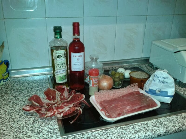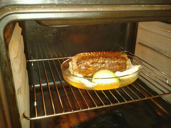 Se echa aceite de oliva en la sartén y se sella. Mientras tanto en una fuente apta para horno, se echa un chorro de aceite, un vaso de vino blanco, un chorro de coñac y la cebolla pelada y cortada en cuatro trozos. Se coloca la carne encima y se mete al horno a 180º durante una hora.
