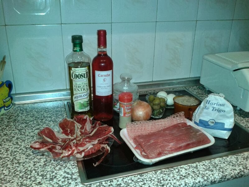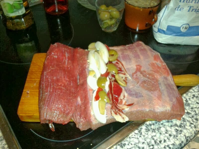 Lo primero que hacemos es abrir la aleta y estirarla para comenzar a rellenarla. Dentro de la carne colocamos las cuatro lonchas de jamón serrano, los dos huevos duros cortados, las aceitunas y el pimiento. Se echa la pimienta negra molida y la sal. Enrolláis la carne bien fuerte y se mete en una red o se ata con un hilo bien fuerte. El siguiente paso es rebozarla en harina.