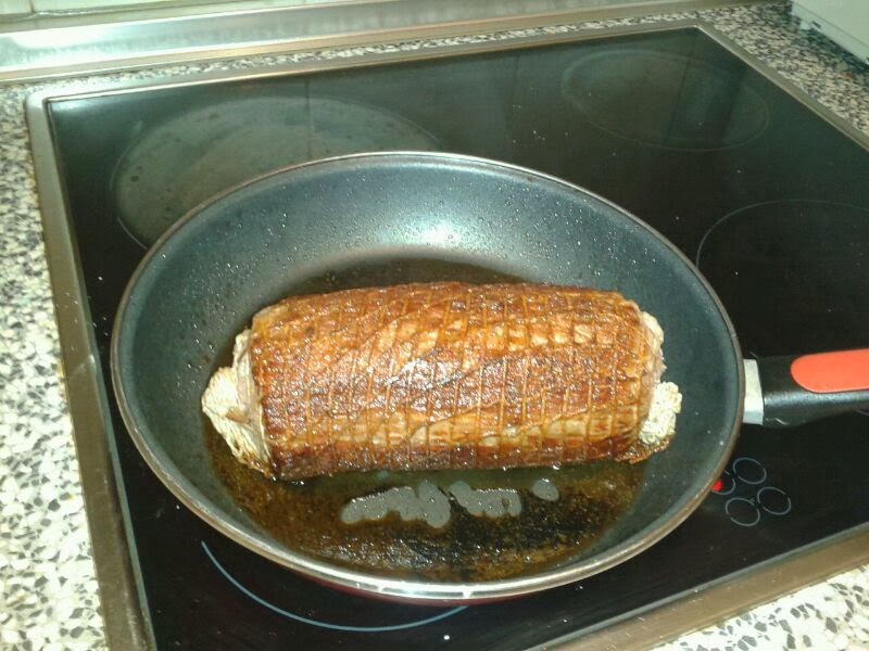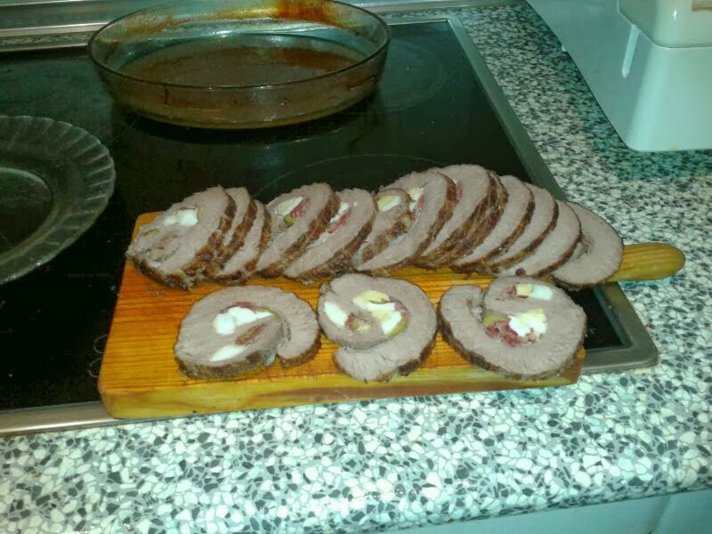 Cuando se haya enfriado la partís en rodajas un poco gruesas y comenzáis hacer la salsa. Se tritura lo que ha quedado en la bandeja, junto con la cebolla con la batidora y se pone en una cazuela con la salsa y se cuece durante 30 minutos para que la carne quede más tierna y ya está lista para servir.