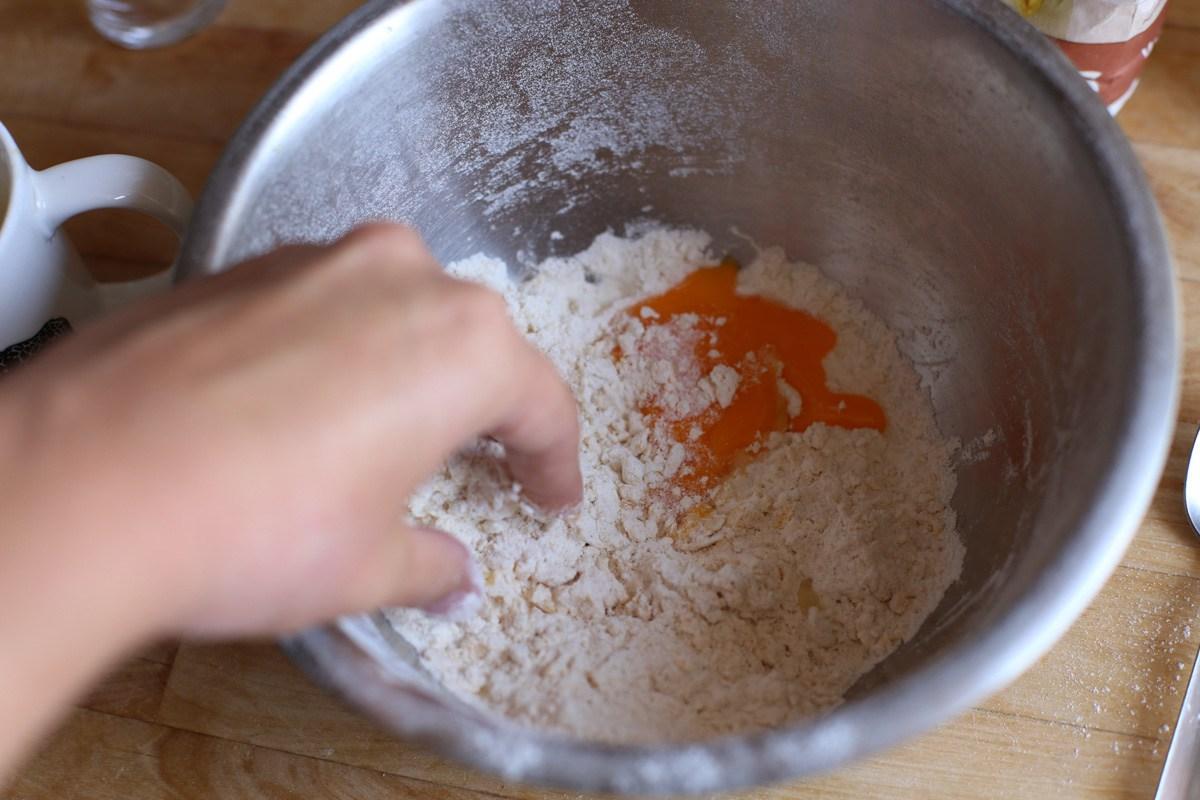 Cernir las harinas con ayuda de un colador y colocarla en un bol. Ir añadiendo las yemas de una en una mientras mezclamos bien hasta obtener una mezcla seca. Añadir 1 tapita de licor y mezclar bien hasta formar una masa lisa y firme. Si la masa no se junta, agregar de a poco 1 o 2 cucharadas de leche, siempre cuidando que la masa no quede pegajosa.
