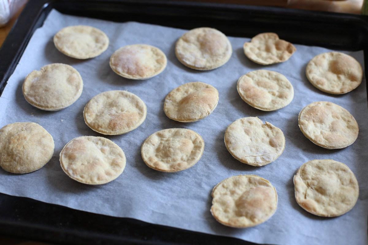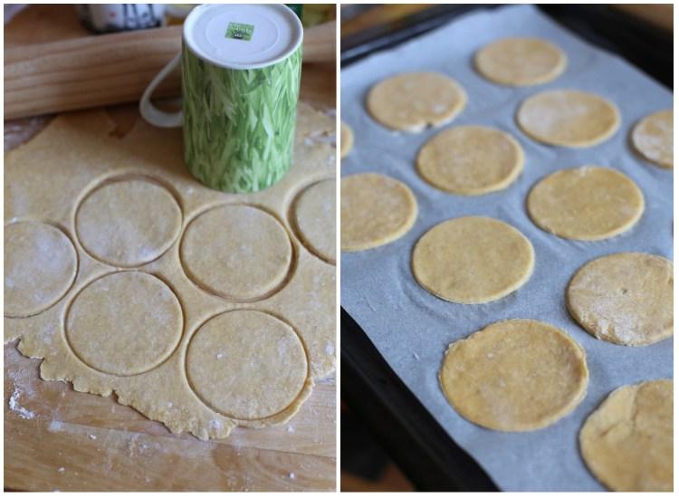 Espolvorear con harina la superficie de una mesa o mesón de cocina. Con la ayuda de un uslero, estirar la masa dejándola muy delgada, cortar en círculos de aprox 4 a 5 cms (puedes ayudarte con el borde de una taza de café). Aprovechar toda la masa.