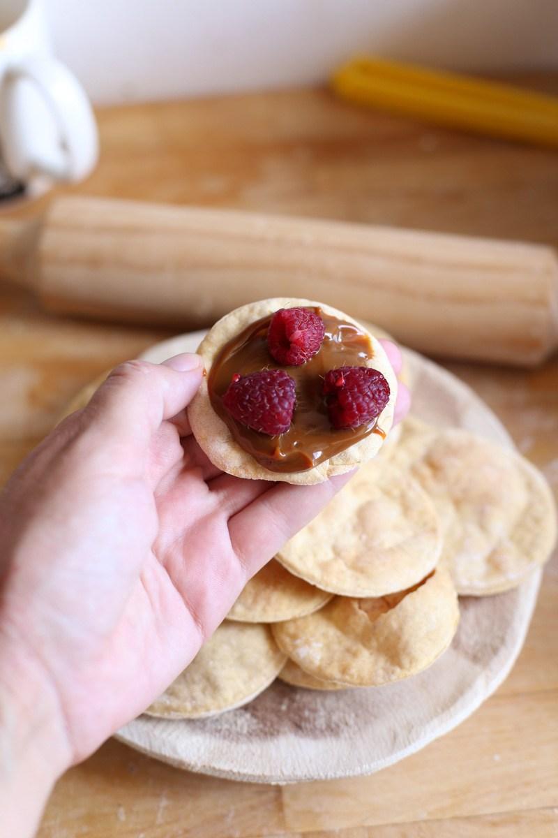 Llevar al horno por 8 a 10 minutos a 180°C o hasta que las tapas de alfajor estén levemente infladas y doradas. Sacar del horno y unir de a dos con el dulce de leche aprox 1 cucharada de manjar y 3 a 4 frambuesas.