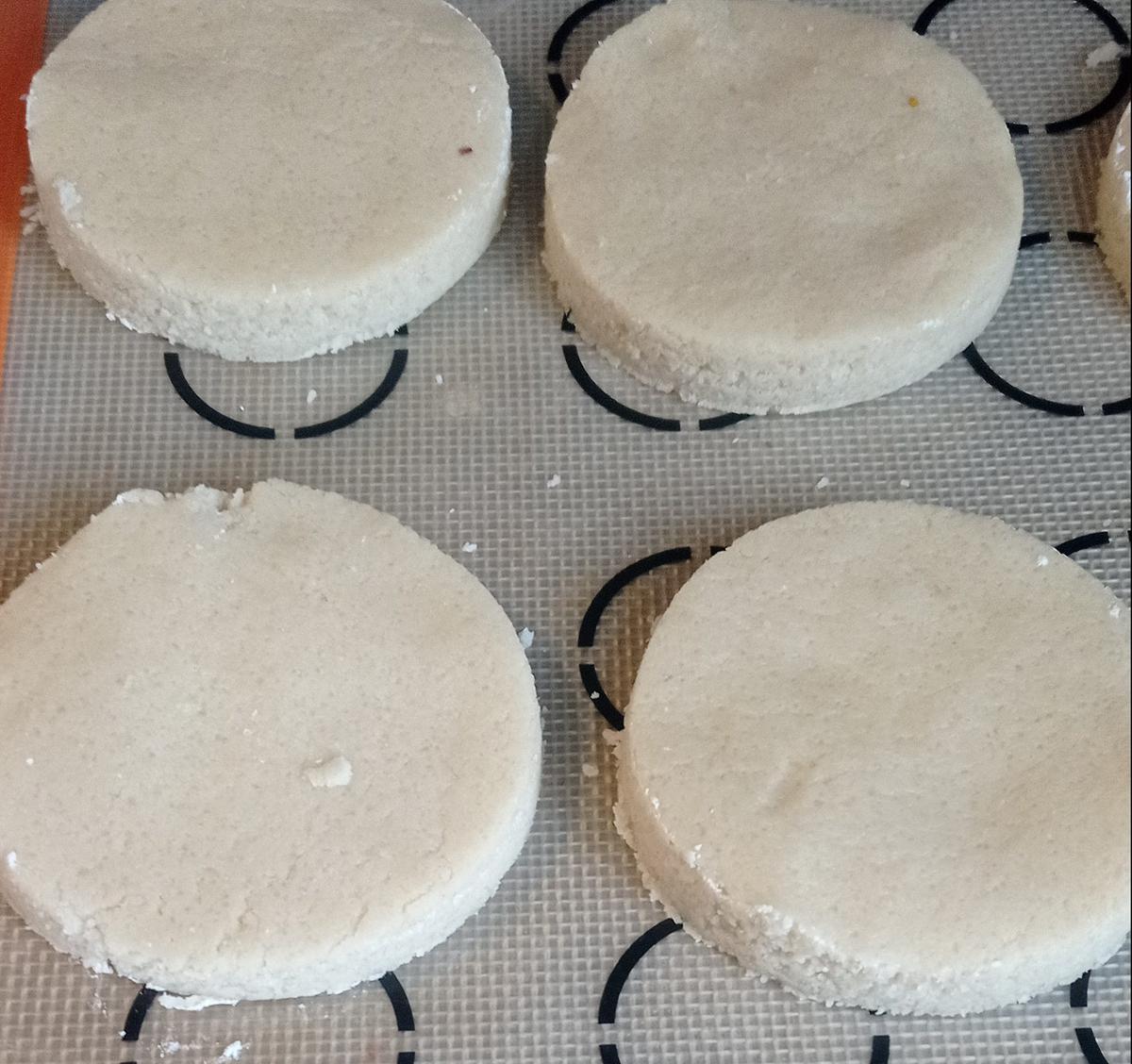 Estirar la masa , yo los hice de casi 1 cm de alto, pero es a tu preferencia .Cortar círculos del tamaño que te gusten , los hice de 7 cm .