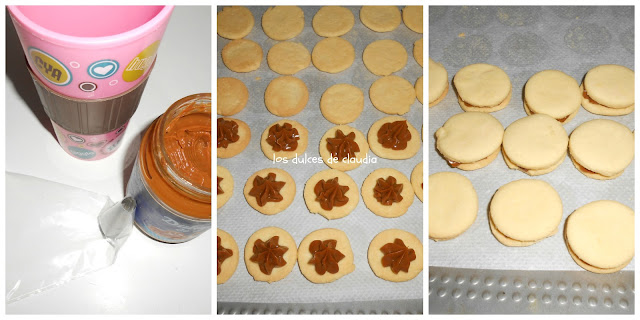 Cuando enfríen rellenar con dulce de leche. Utilizo una manga pastelera y un vaso grande para poner el dulce de leche y no ensuciar.