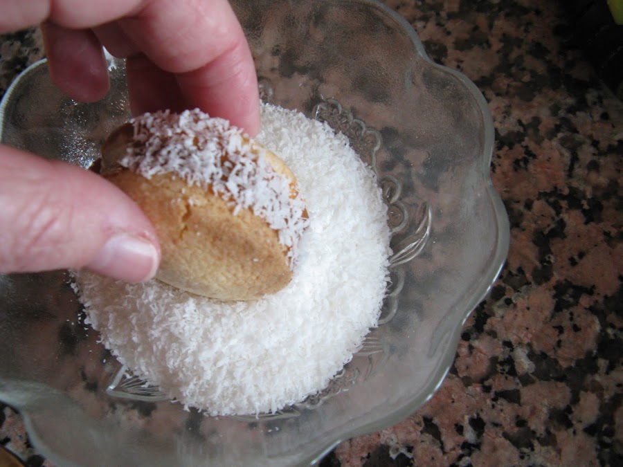 Rellenamos con dulce de leche y apretamos un poco, nos ayudamos con un cuchillo para extender lo que sobresale y por último pasamos por coco rallado
