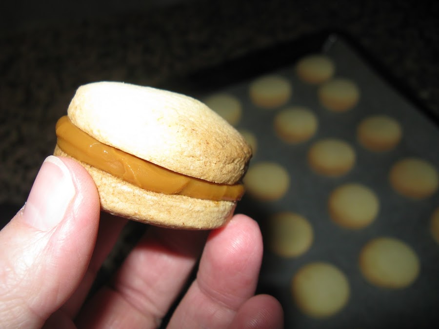 Es una "galleta" riquísima, me decanté por la que va rellena de dulce de leche, que puede ser sustituido por leche condensada una vez cocida, os cuento.