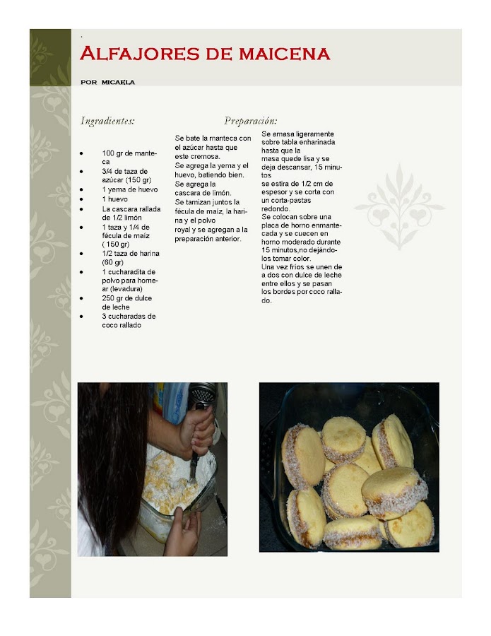 hoy hice mis alfajores de maicena, uso una receta mia. Salen 30 alfajorcitos con la receta! Ingredientes: 100gr de manteca, 150gr de azúcar, 2huevos, 1CDA de esencia de vainilla, 300gr de maicena, 175gr de harina 7gr de polvo de hornear Dulce de leche repostero c/n coco rallado c/n. PASOS: Juntar la manteca derretida con el azúcar, incorporar los huevos y la esencia. Tamizar la harina junto ...
