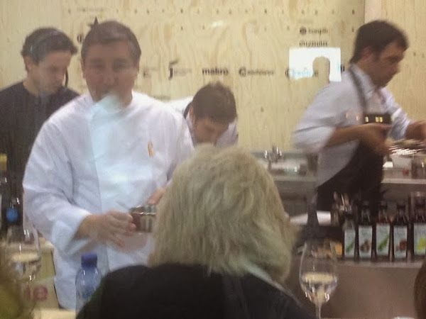 Después llegué al pabellón de Alimentaria Experience y en uno de sus show cookings estaba Joan Roca, el mejor cocinero de mundo, elaborando un menú para unos pocos privilegiados. La zona donde se encontraba el chef estaba acristalada, lo que desde mi punto de vista fue un gran error de la organización. Supongo que la idea era dar exclusividad al asunto, pero si esto fuera así pienso que hubiera estado más acertado realizarlo en una zona que no fuera tan accesible.