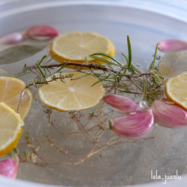 En un recipiente con agua vamos añadiendo sal hasta que un huevo flote, agregamos vinagre, limón en rodajas, tomillo, laurel, romero y unos dientes de ajo.