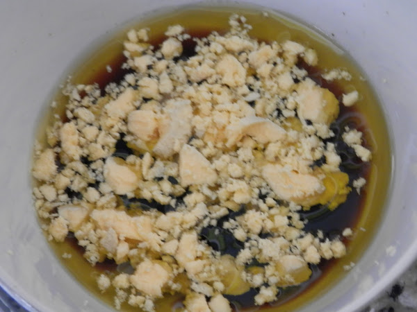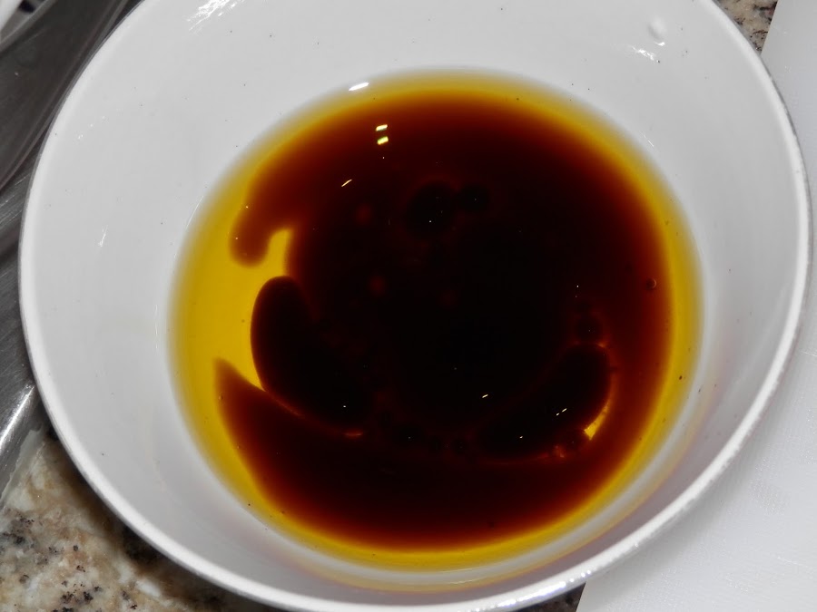 En un bol pequeño, ponemos el aceite, la reducción y batimos bien. Agregamos la yema y seguimos batiendo.