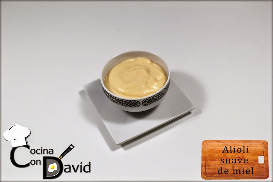 Una vez tengamos el alioli añadimos un chorro generoso de miel y batimos de nuevo para mezclarlo, le aportará dulzura y suavidad a la salsa.