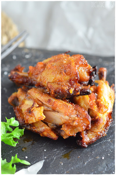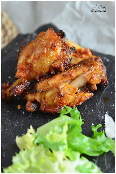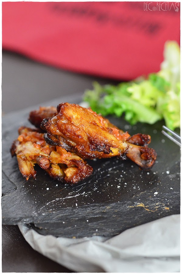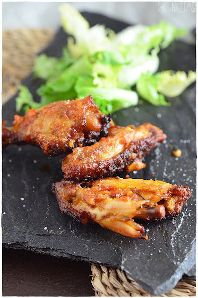Estas alitas las descongele la noche antes y el día que las íbamos a comer, las embadurné bien con la salsa romesco metiéndolas al horno a 180 grados durante unos 20 minutos. Pasado el tiempo las di la vuelta y las pinte nuevamente con un poco más de esta salsa poniéndolas a gratinar durante 5 minutos
