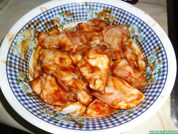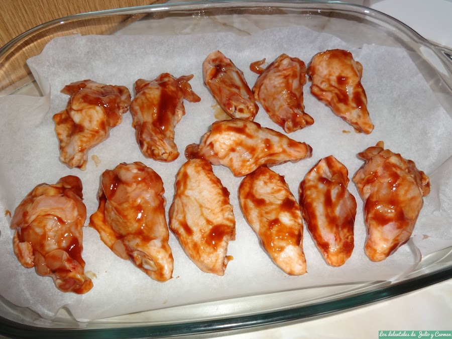 Una hora antes de ponernos a preparar el plato, pondremos las alitas en una fuente y verteremos sobre ellas la salsa, embadurnándolas bien por todos los lados. Las tapamos con papel transparente y las dejaremos en la nevera. Cuando mas tiempo mejor, pero con una hora será suficiente.