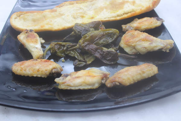 En la última tanda colocamos el pan sobre las alitas y los pimientos, partido por la mitad, así se nos tostara el pan y adquirirá el sabor del pollo.