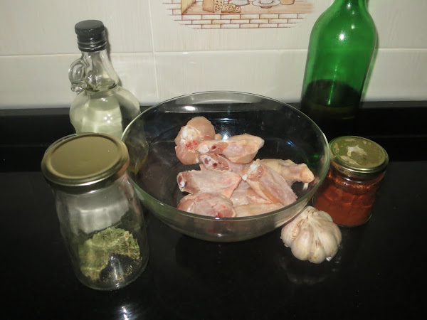 Comenzamos con el adobo de alitas, picamos en trozos pequeños el ajo y lo echamos en el bol de las alitas. Luego en un vaso añadimos las dos cucharadas de aceite de oliva, el orégano, el pimentón y un poco de sal y pimienta. Echamos el medio vaso de vino y rociamos las alitas con la mezcla.