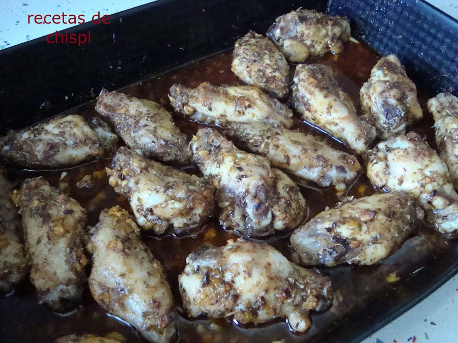 Poner las alitas en una fuente grande para que todas esten bien colocadas e impregnar con un pincel de cocina por las dos caras y dejar macerar en el frigorifico todo la noche con la fuente tapada con papel film.