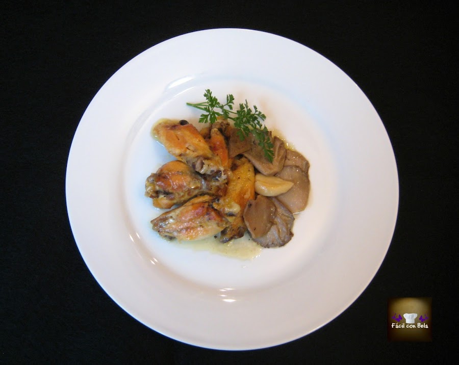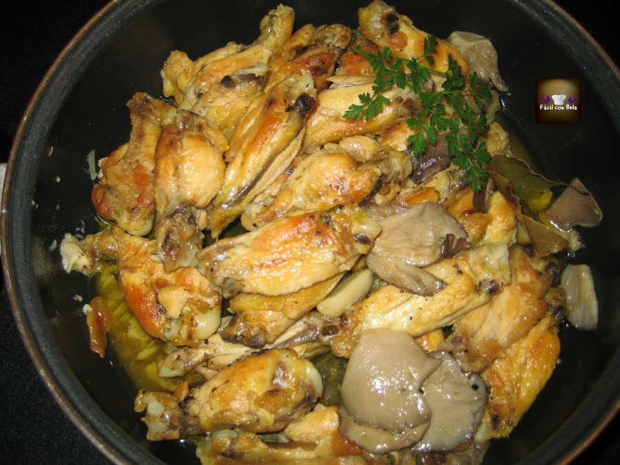 Machacamos los dientes de ajos con piel y los añadimos sin piel a las alitas, el laurel y el tomillo dorar 5 minutos.