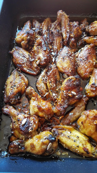 3. Vertemos las alitas con toda la salsa en una bandeja plana o la misma del horno y las repartimos bien para que no queden una encima de la otra.