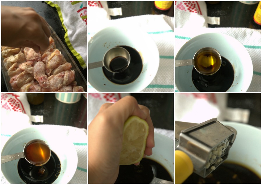 Take out chicken wings dish from the fridge and keep 1/2 cup of marinate sauce reserved.