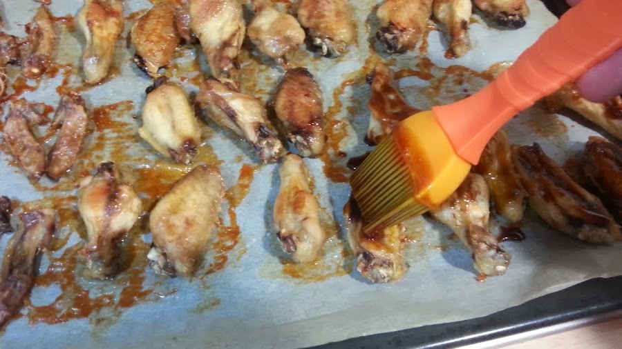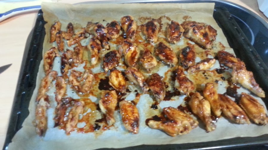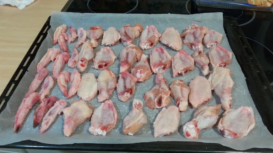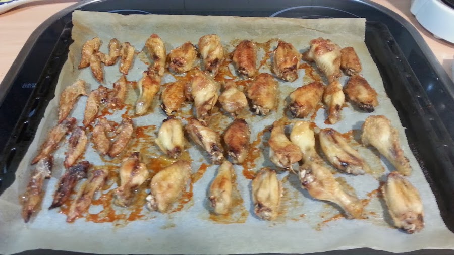 Poneis en una bandeja de horno papel vegetal para que no se peguen, colocais las alitas, salpimentais y al horno que previamente habeis precalentado a 180º durante unos 20 minutos, pero el tiempo depende del horno, asi que id vigilandolas