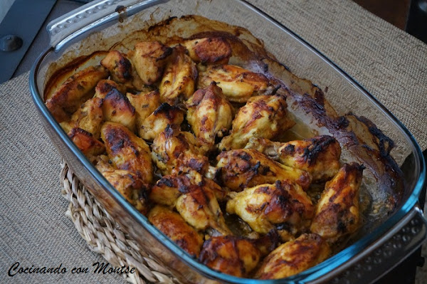 Añadimos las alitas de pollo en el bol con la salsa preparada, untamos y mezclamos bien las alitas. Las pasamos a una fuente para horno. Las dejamos reposar un rato, un mínimo de 30 minutos.
