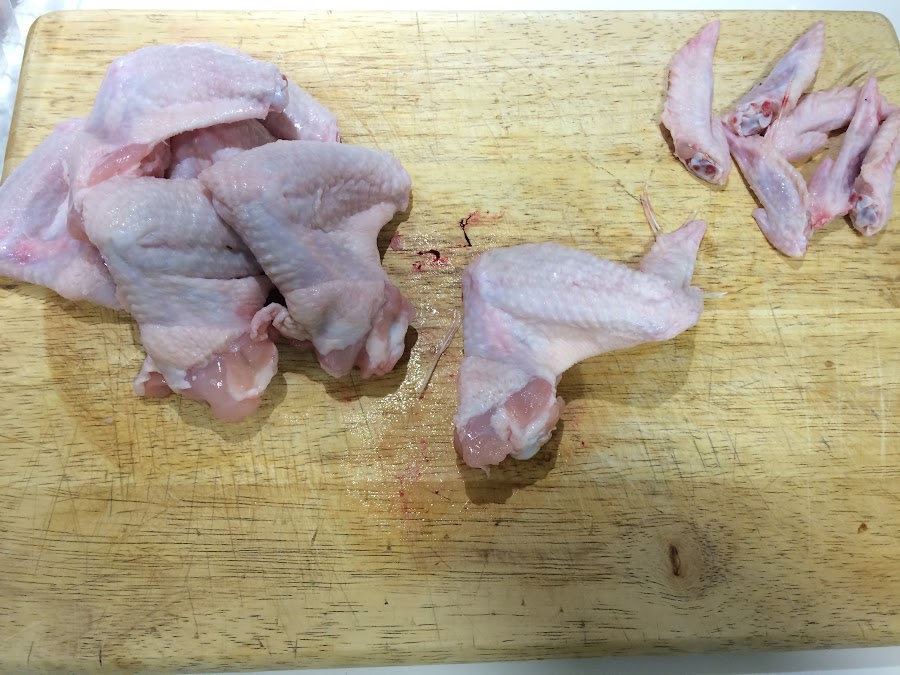 En primer lugar limpiamos las alitas de pollo, las despuntamos y las partimos por la mitad.