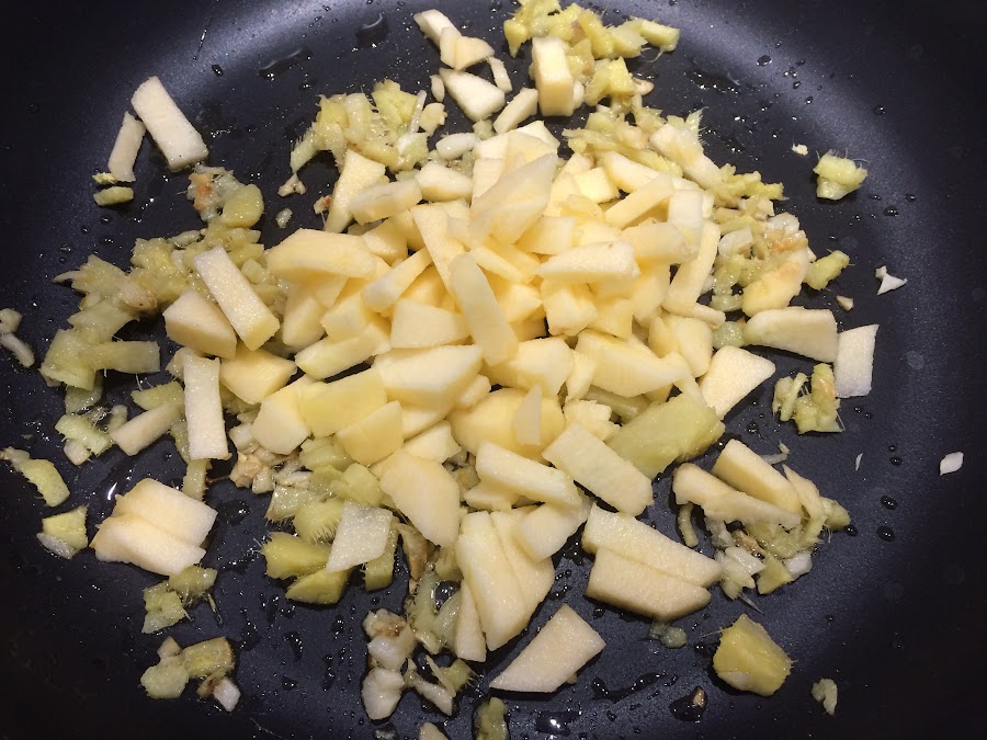 Pasado este tiempo incorporamos la manzana pelada y cortada a dados pequeños. Dejamos 10 minutos pochando.