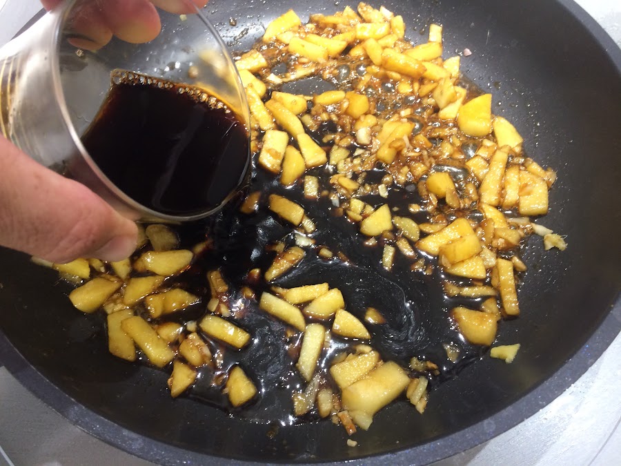 Añadimos los 100 ml de salsa de soja y reducimos.