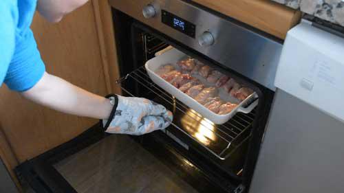 Precalentamos el horno a 200 ºC o 400 ºF y cuando esté caliente metemos las alitas, a mitad de altura, con calor por arriba y por abajo, y dejamos que se hagan por unos 15 o 20 minutos aproximadamente.