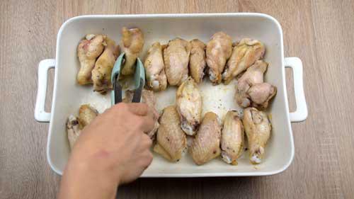 Una vez que pase el tiempo, sacamos las alitas con cuidado de no quemarnos, y les damos la vuelta para hornearlas ahora por el otro lado.