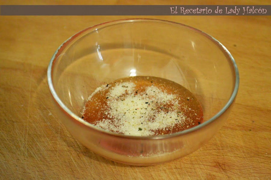 Para la salsa, añade en un bol dos cucharadas de miel, una pizca de sal y pimienta y un chorrito de aceite.