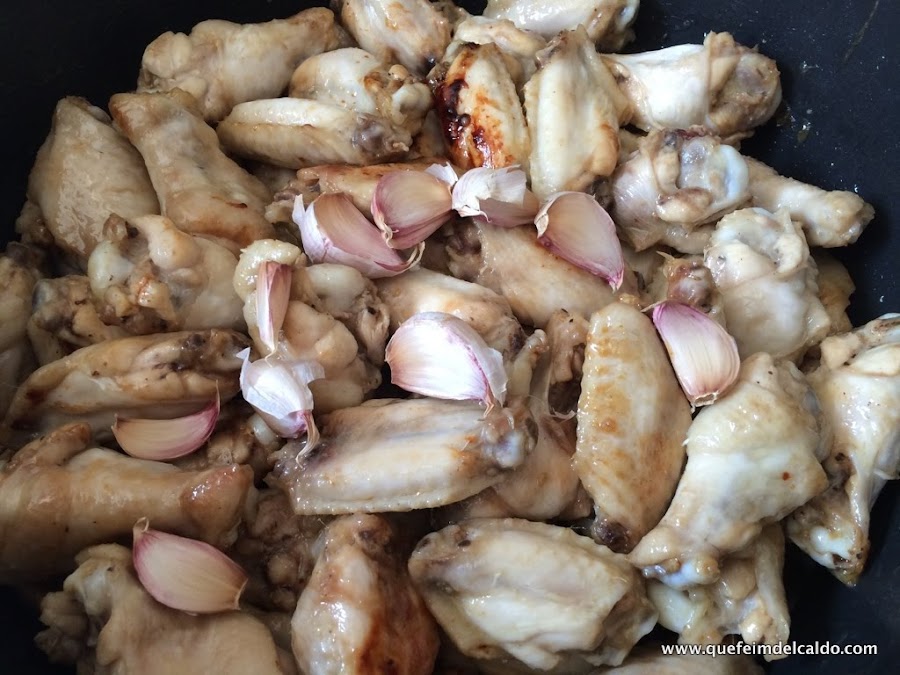 Mientras se van friendo ponemos sobre las alitas 6 dientes de ajo machacados.