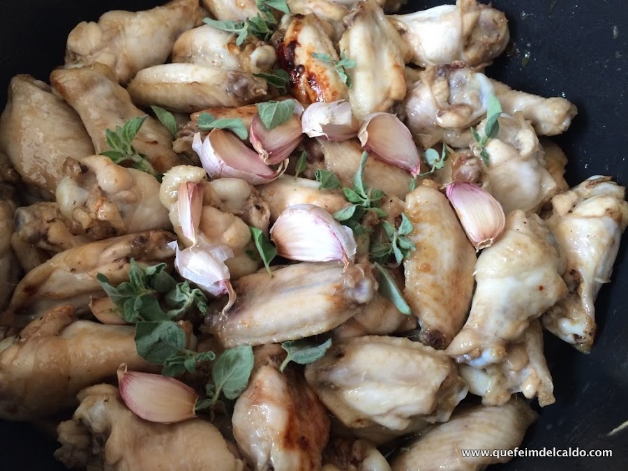 Picamos el orégano fresco y lo ponemos. Pasados los 25 minutos damos la vuelta a las alitas y los dejamos 25 más friéndose por el otro lado.