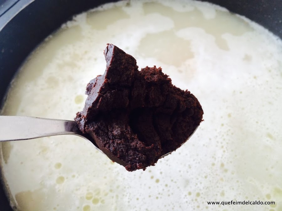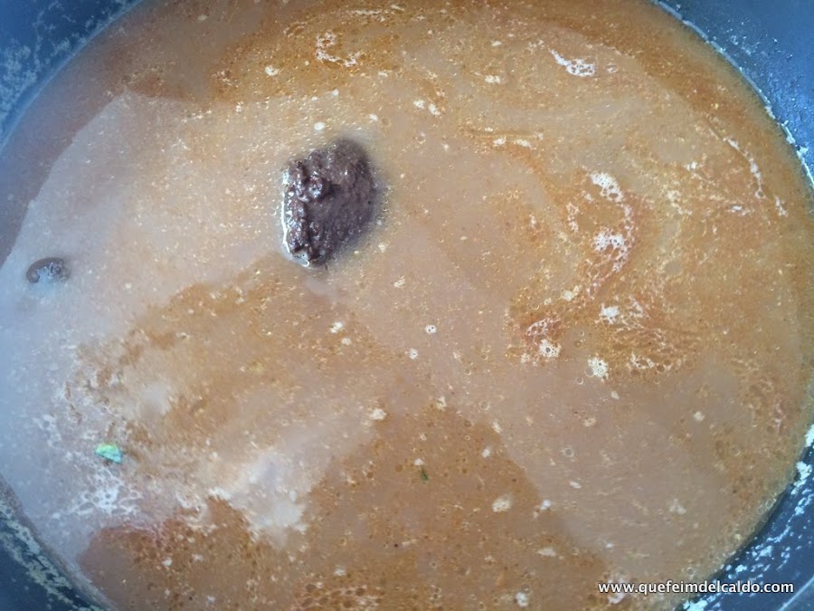 Ponemos aproximadamente 3 cucharadas soperas de salsa de mole en un litro de caldo de ave hirviendo