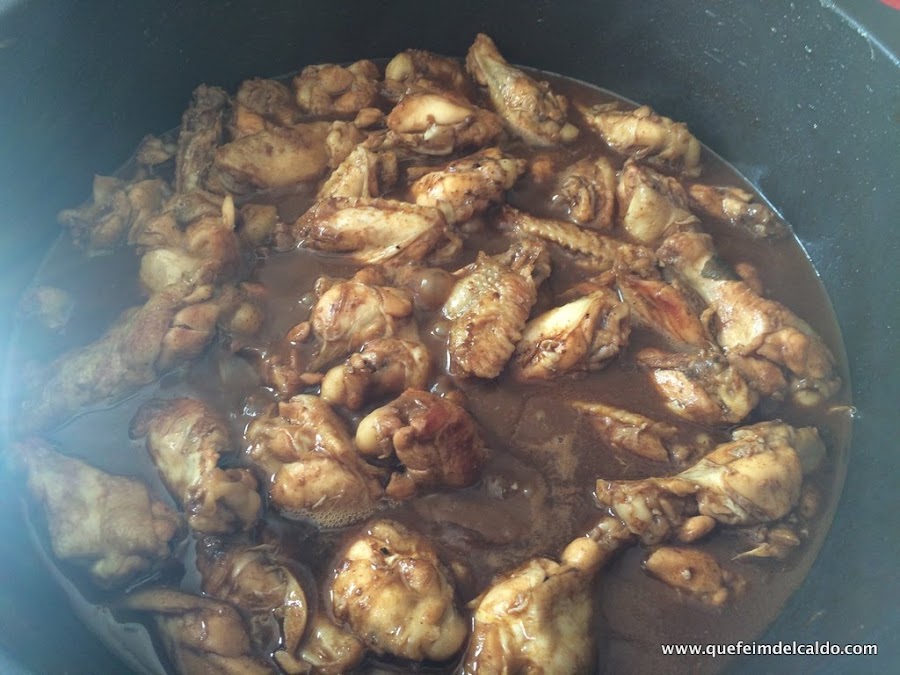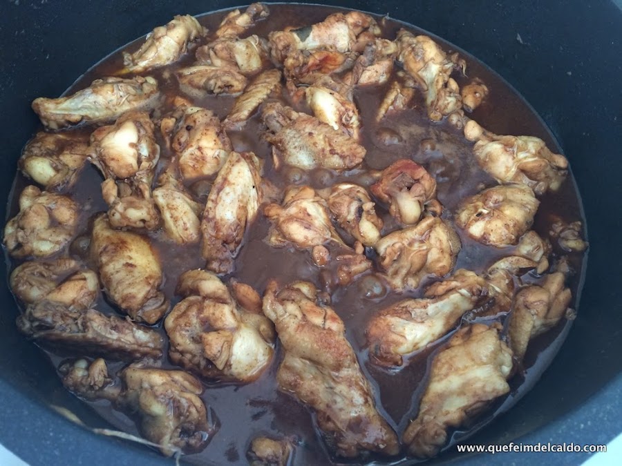 Es importante ir moviendo las alitas de vez en cuando PERO MUCHO CUIDADO, las alitas estarán tiernas y la carne se puede desprender, así que lo mejor es mover la cazuela sin tocar las alitas.