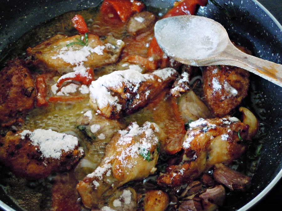 Echa ahora la cucharada de harina, remueve y deja que se espese un poco la salsa, si ves que te hace falta puedes añadir un poco de agua, da un hervor y apaga el fuego.