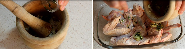 Machacamos los ajos y el perejil y se lo echamos a las alitas junto con un chorrito de aceite de oliva , las dejamos macerar 1 hora.
