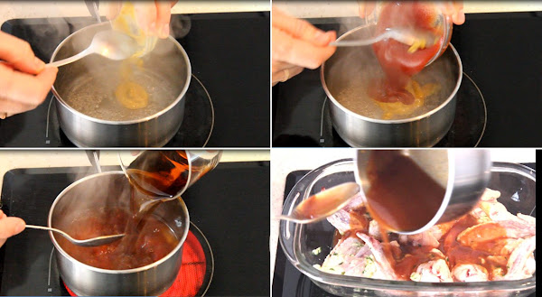 Mezclamos el ketchup, la mostaza, la miel y la salsa de soja y le añadimos unas gotitas de tabasco si nos gusta el puntito picante, si no, no se lo echamos, añadimos el agua y mezclamos bien. DEjamos que hierva unos minutos , hasta que empiece a espesar.