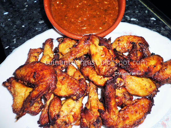 Precalentar el horno a 200º y asar las alitas untadas en aceite durante unos 20 minutos. Reservar. Preparar la marinada mezclando todos los ingredientes de la salsa. Sumergir las alitas en la marinada y remover para que se empapen de ella. Reservar tapadas en el frigorífico 24 horas.