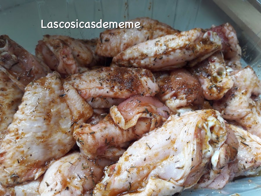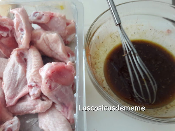 En un bol ponemos todas las especias con la salsa soja y la miel, lo mezclamos bien. Mojamos todas las alas y las dejamos adobar de un día para otro.