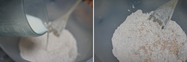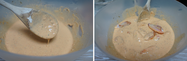 Cogemos un bol con la mitad de harina y especias e iremos añadiendo leche o agua o mitad de cada como hice yo, necesitaremos unos 500 ml. de líquido, puede variar según la harina. Iremos mezclando la masa con el líquido poco a poco hasta que nos quede como una crema.