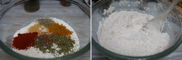 Para hacer las alitas de pollo crujientes lo primero hay que preparar la harina con las especias. Ponemos un bol, añadimos todas las especias y una cucharadita de sal. Lo mezclamos todo bien. Una vez tenemos mezclada la harina, cogeremos la mitad, la pondremos en otro bol y la reservamos.