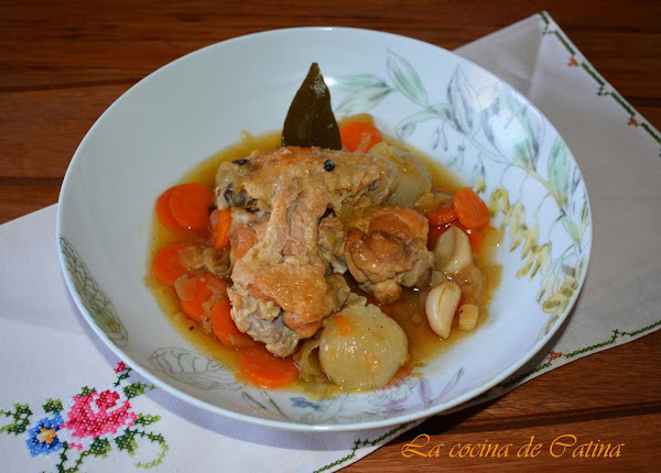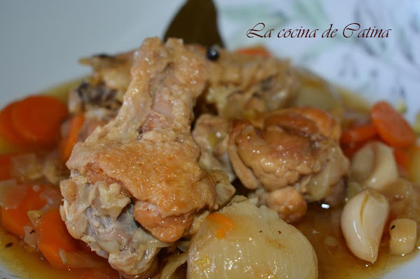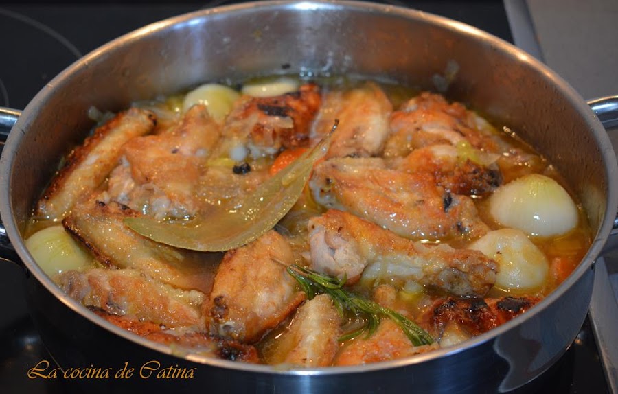 Añadimos las alitas reservadas, las cebollitas francesas, el vino, el vinagre, los granos de pimienta, la hoja de laurel y la ramita de romero o tomillo.