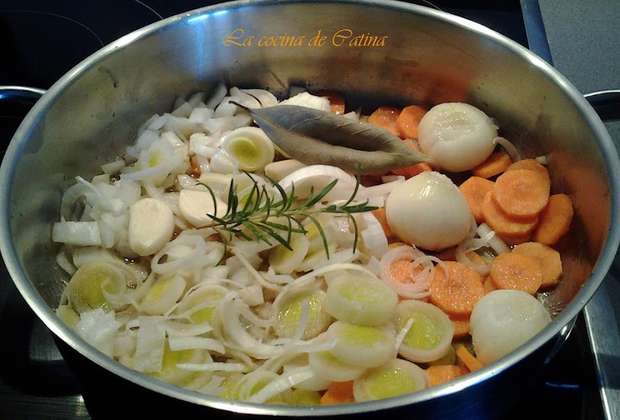Pelamos y cortamos las zanahorias en láminas, los puerros, la cebolla y pelamos los ajos. En la misma cazuela donde hemos dorado las alitas, rehogamos todas las verduras, sazonamos y seguimos friendo durante 10 minutos más.