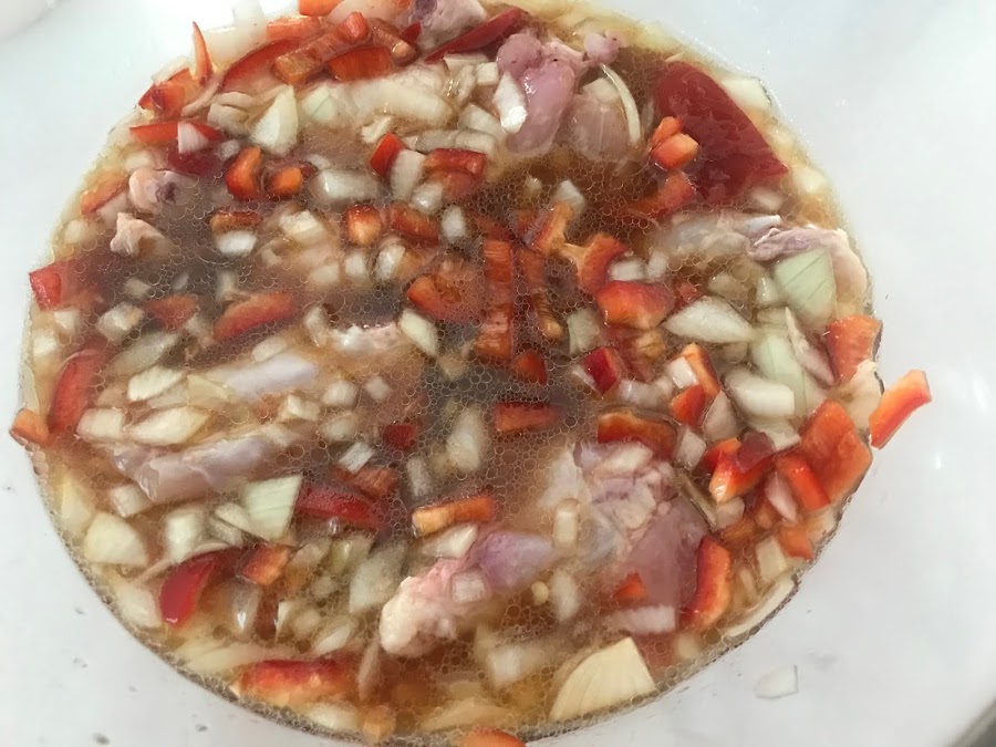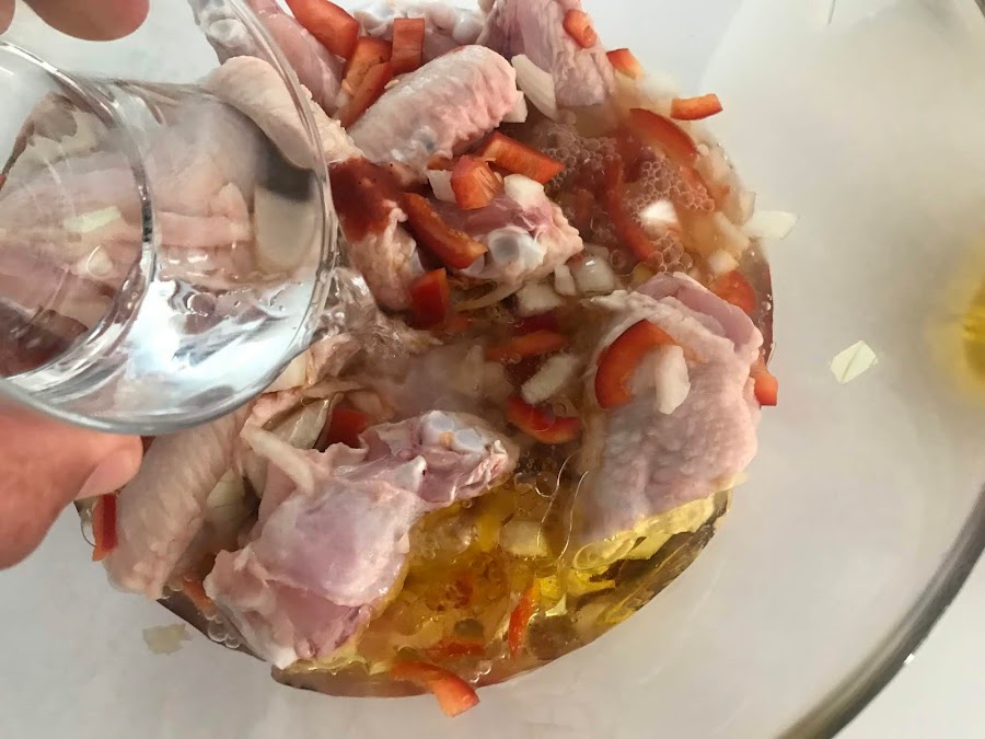 Nos ponemos a empatar las alitas, en el fondo de una fuente colocamos la reducción que hemos hecho del caldo de maceración.