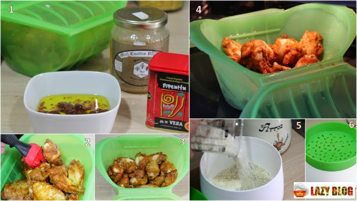 Podéis seguir la preparación mirando las imagenes siguientes. Preparamos un adobo meclando la miel con el aceite de oliva y añadimos el pimentón. Mezclamos bien los ingredientes (1) y los utilizamos para barnizar las alitas, (2) y colocarlas en el estuche. Las cocinamos durante 10 minutos a 800W con el estuche cerrado.