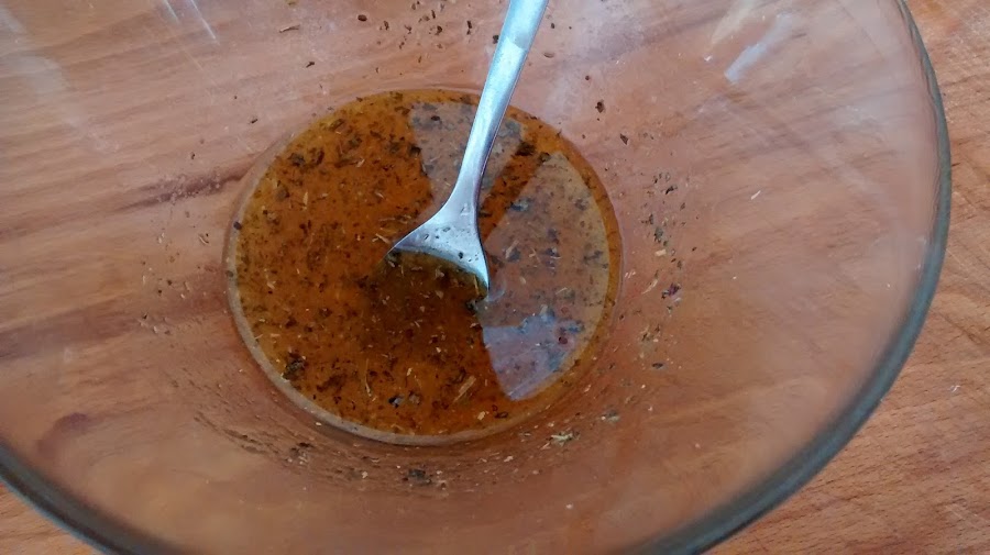 A continuación en un pequeño bol mezclamos, medio brick de vino blanco, sal, aceite y las especias indicadas al gusto. A mi me gusta suave pero con saborcito.