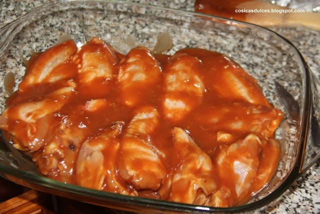 Colocamos la alitas y dejamos marinar al menos durante cuatro horas en el frigorífico. Transcurrido ese tiempo colocamos las alitas bien extendidas en una bandeja de horno y vertemos todo el marinado sobre ellas.