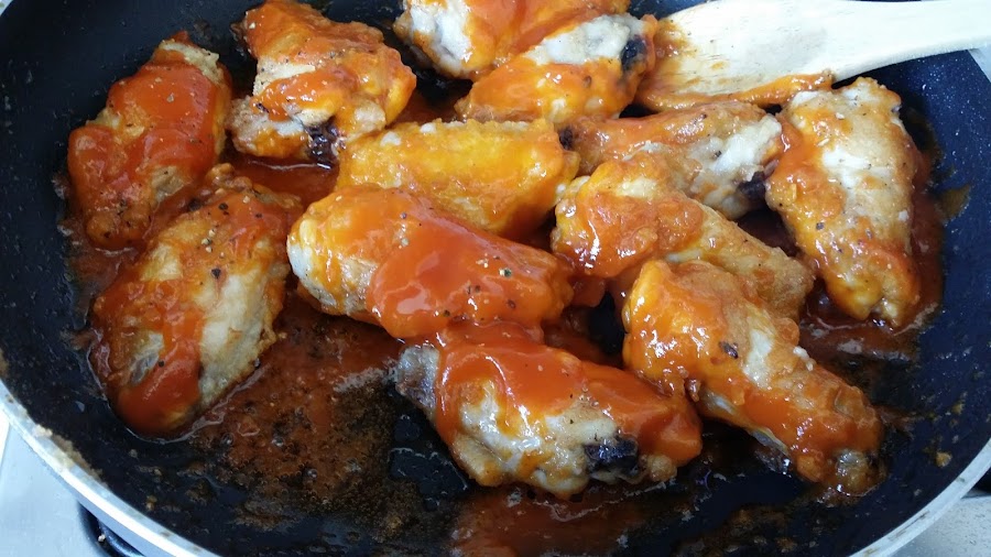 Una vez las tengamos las alitas listas, les añadimos el tomate frito, un poco de pimienta y el tabasco al gusto, yo suelo usar 2 cucharadas de café, y lo dejamos unos minutos a fuego bajo.