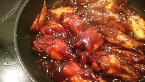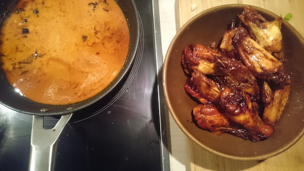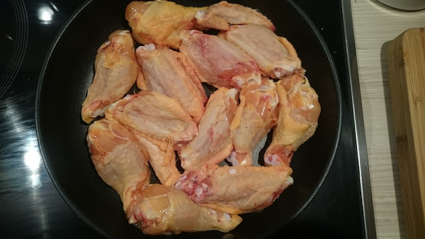 En una sartén amplia disponemos las alitas. Vertemos la salsa por encima (cubriendo bien todos los trozos) y ponemos a calentar. Tapamos y dejaremos que suba el hervor y luego bajaremos el fuego. El truco está en que se cocine a fuego lento durante bastante tiempo, como 1 hora.